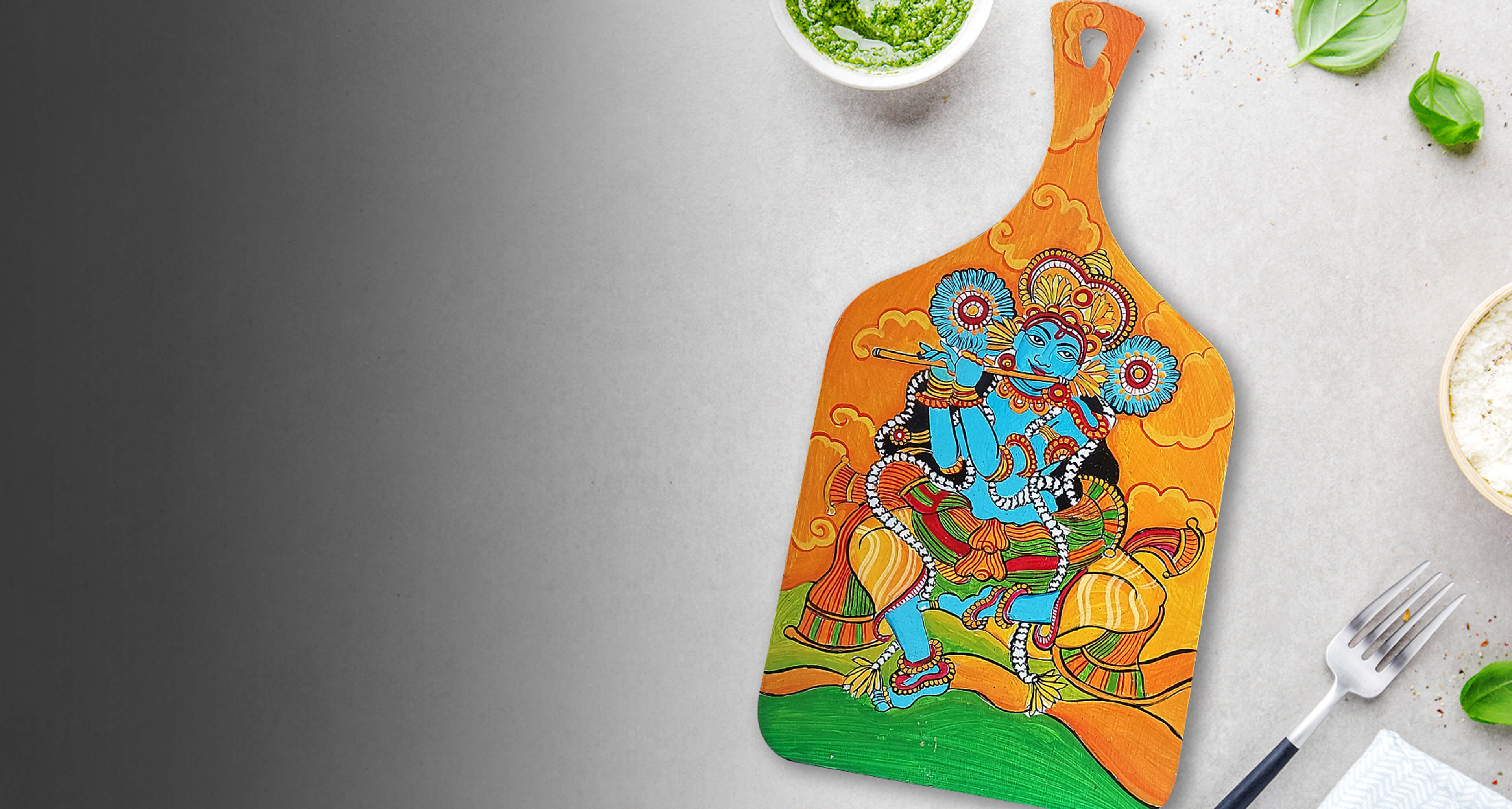 A mural is an artwork or a painting usually done on a wall. While the Kerala region abounds in murals, being the second largest such spread in India after Rajasthan region, the oldest mural paintings in the Kerala region are estimated to have been made during the 9th and 10th centuries. The themes of this art form mainly depict ancient Indian epics such as Ramayan, Mahabharat, the Purans, etc., and Kerala murals stand out for their rich, delicate, and aesthetically pleasing presentation of Hindu gods. The deities are presented in a beautiful stylized manner, with magnified features like wide eyes, elongated lips and particular body proportions.